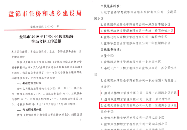 天格物業(yè)榮獲2019年遼寧省物業(yè)行業(yè)優(yōu)秀會員單位榮譽(yù)稱號;2020年遼寧省房地產(chǎn)行業(yè)協(xié)會第六屆理事會副會長單位;“天格褐石公館”項(xiàng)目榮獲2020年遼寧省物業(yè)服務(wù)標(biāo)桿項(xiàng)目和2020年度盤錦市物業(yè)管理優(yōu)秀住宅小區(qū)。